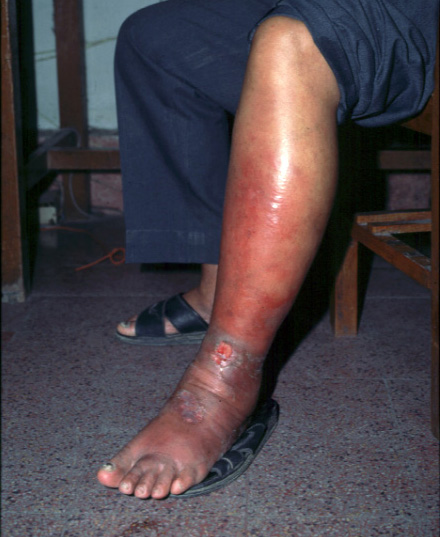 Cellulitis of lower extremity : Note the entire left leg is markedly swallen and reddish. It is