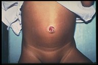 The umblical cord is painted with triple dye. The cord will dry and detach afterwards