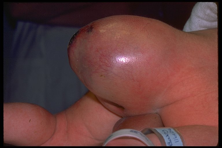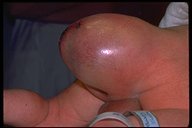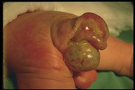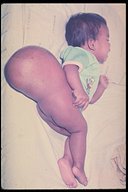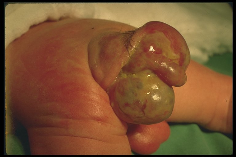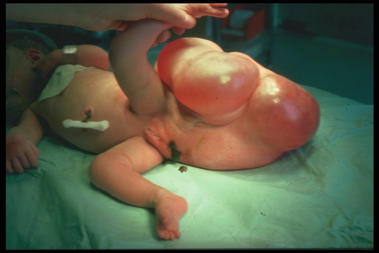 Sacrococcygeal teratoma with necrosis of the overlying skin, lateral view