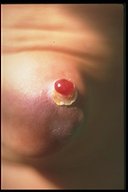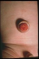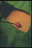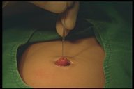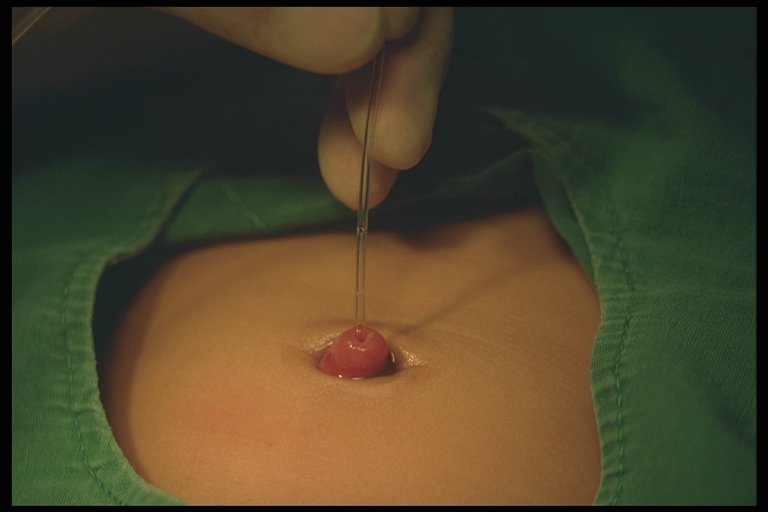 Umbilicated fistula is demonstrated on the top of umbilical polyp suggesting that there is a connection into an internal organ