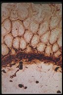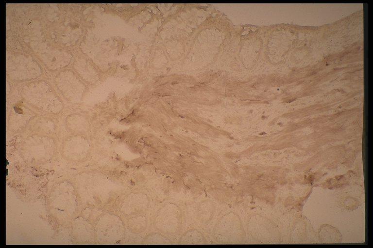 Increased acetylcholinesterase activity in Hirschsprung's disease, thick staining is observed in mucosa and submucosa layer