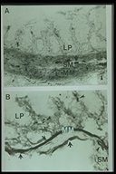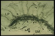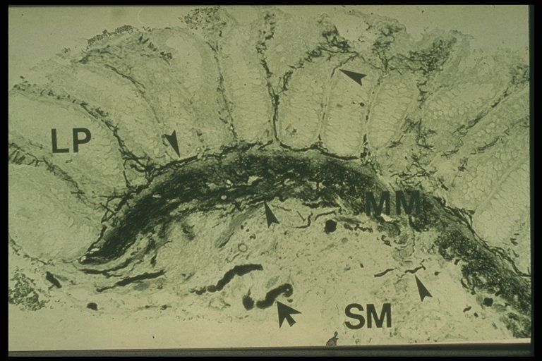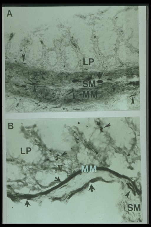 Increased acetylcholinesterase activity in Hirschsprung's disease, thick staining is observed in mucosa and submucosa layer (LP: lamina propria, MM: muscularis mucosae, SM: submucosa)