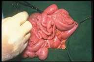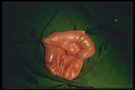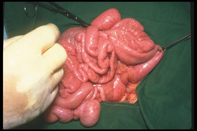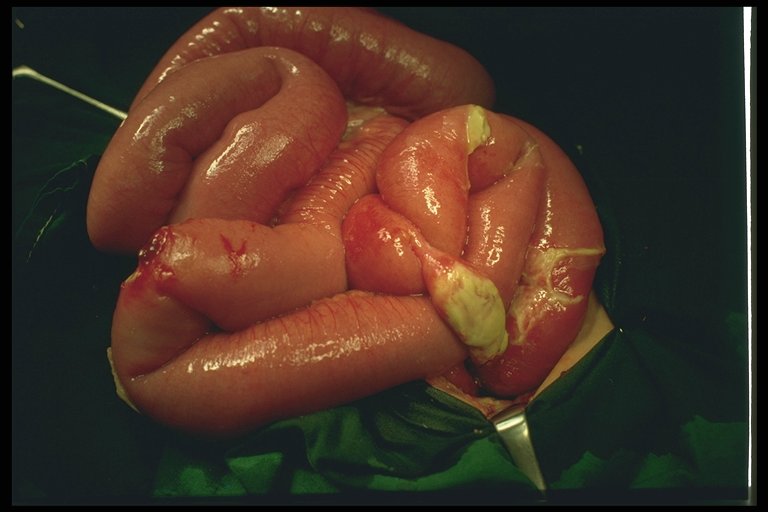 The perforation of an inflamed Meckel's diverticulum caused peritonitis and partial obstruction. Fibrin coated on the diverticulum is noted