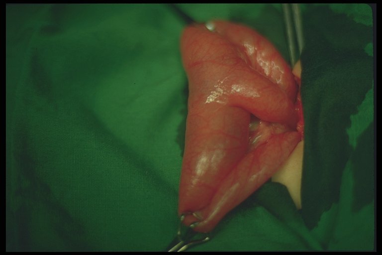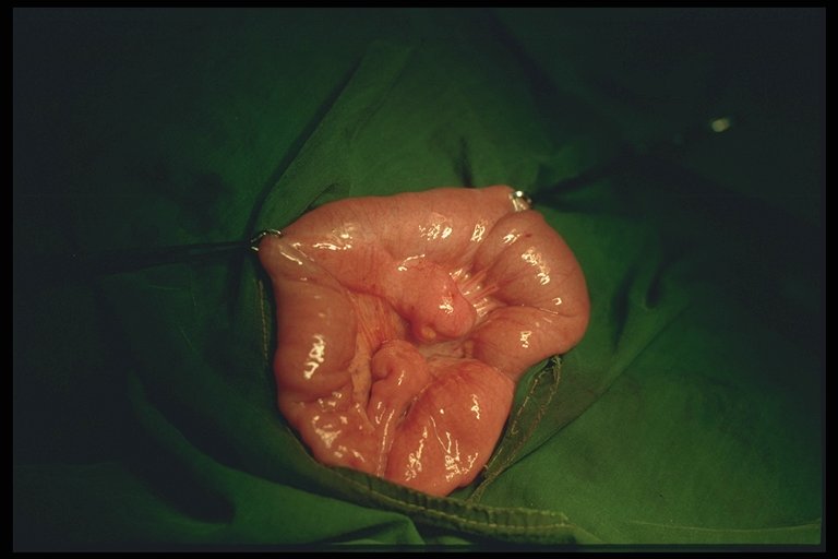 Operative view at ligament of Trietz, the jejunum is found intussuscepted by the proximal duodenum