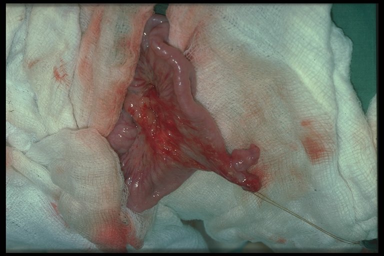 A Meckel's diverticulum is found adherent to the anterior abdominal wall at umbilicus. The attached band (omphalomesenteric or Meckel's band) caused small bowel obstruction in this child