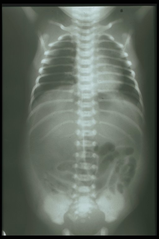 Large gas shadow at the central abdomen in the supine film and the well outlined falciform ligament (white line) indicates bowel perforation