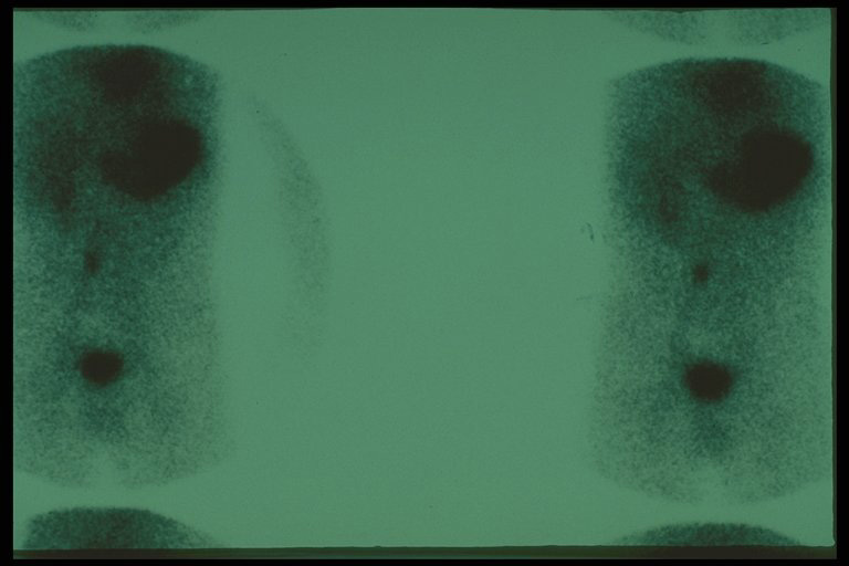 Meckel's scan. Technetium 99m radionuclide scan demonstrates concentration in the mucosa of stomach, urinary bladder and in the right lower abdomen - the location of the Meckel's diverticulum