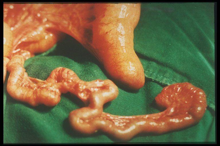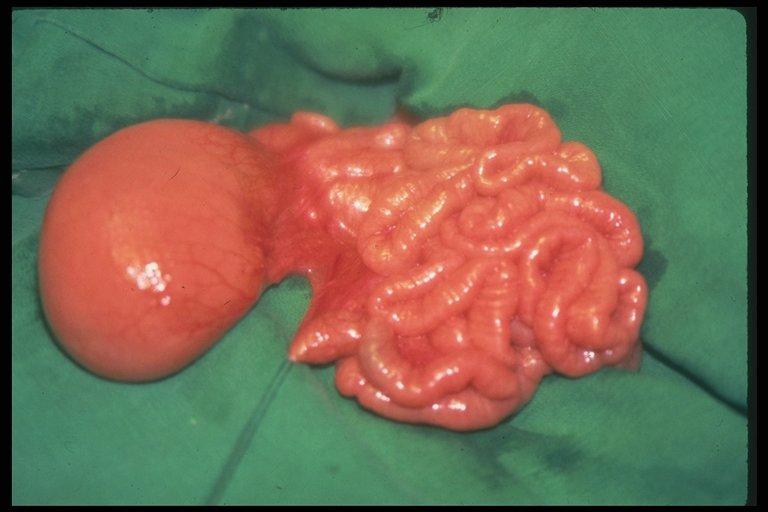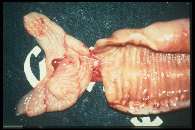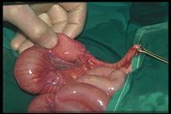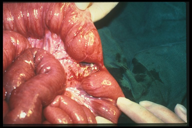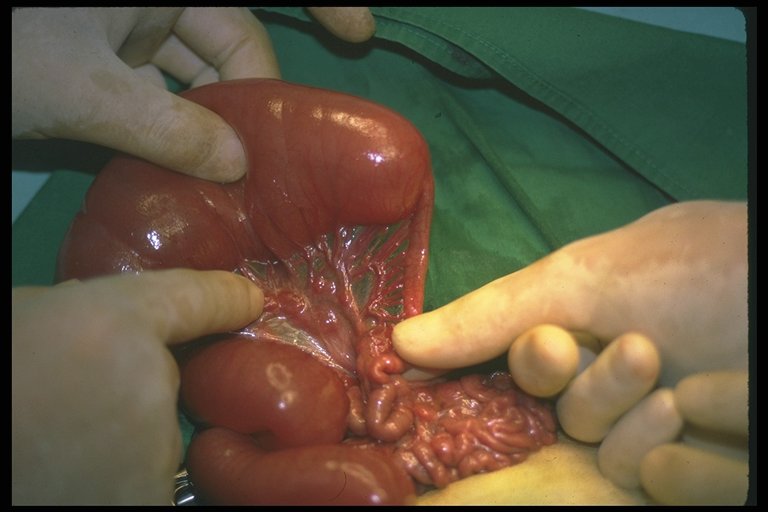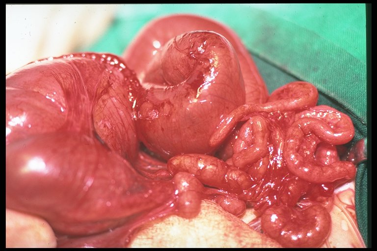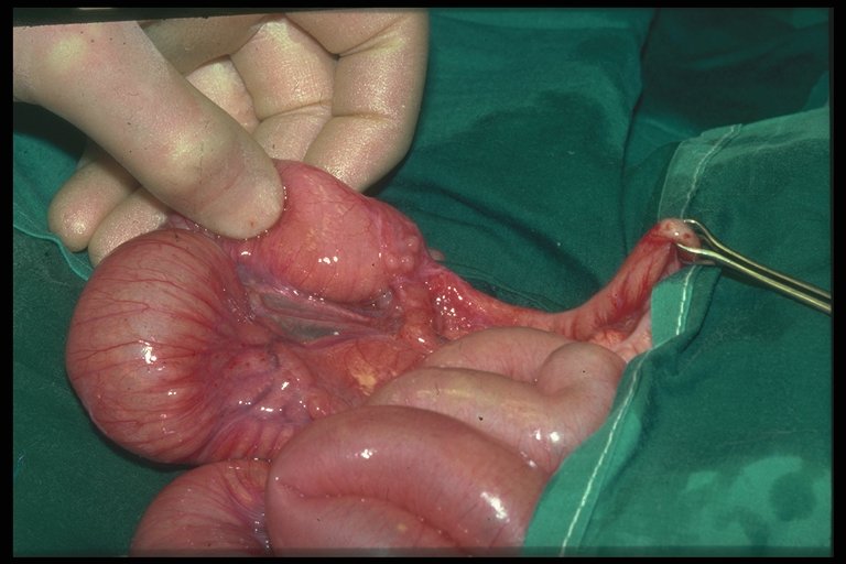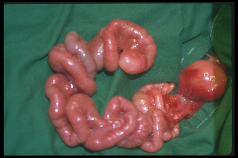 Operative finding of intestinal atresia type I, intestinal intraluminal web. Disproportion of connected segment of jejunum is noted and indicated atresia type I