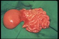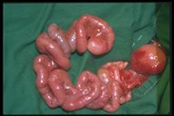 Multiple jejunal atresia. At surgeyr, jejunal atresia with dilated proximal pouch and varied length of small distal segments sausage-like are found. These segments connect to each other with cord-like (atretic part)-intestinal atresia type II.
