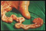 Multiple jejunal atresia. A twisted calcified segment is found which may due to intrauterine volvulus caused atresia. Multiple "sausage-like" segments of jejunal atresia