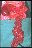 Operative finding of intestinal atresia type IV, marked mesenteric defect is noted. The distal part of intestine with mesenteric defect curls around the feeding vessels - christmas tree or apple peel appearance.