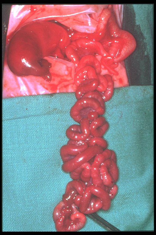 Operative finding of intestinal atresia type I, intestinal intraluminal web. Disproportion of connected segment of jejunum is noted and indicated atresia type I, the proximal portion is markedly dilated and distended but the distal loop is very small