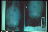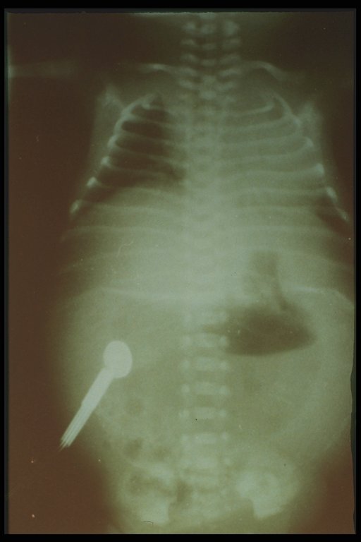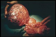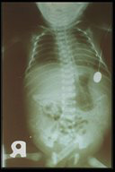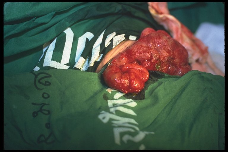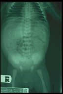 Meconium peritonitis. At operation, matted loops of intestine with calcification over the surface are shown. The perforated site of intestine is also demonstrated where there is a leak of meconium.