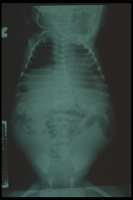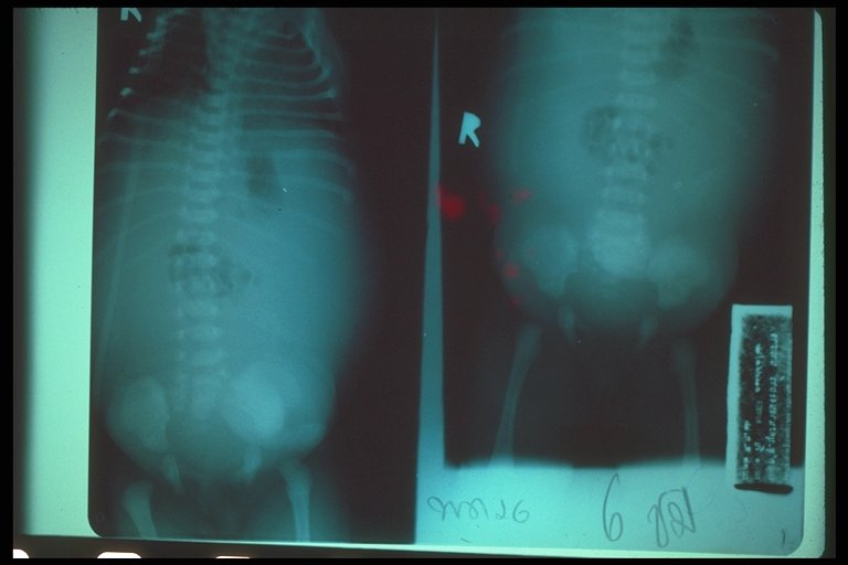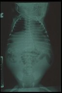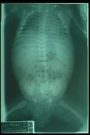 Meconium peritonitis. Scattered concentric pattern of calcification spread throughout the peritoneal cavity with intraabdominal fluid shows that there was meconium leakage sometime during fetal life.