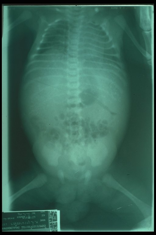 Meconium peritonitis. A classical abdominal X-ray demonstrates calcified extravasated meconium in the peritoneal cavity since fetal growth. Free air in the abdomen (football sign) is also noted.