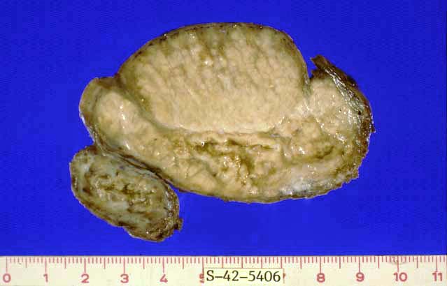 Multiple yellowish white lesions distributed over the cut surface of testis along with central caseous necrosis.