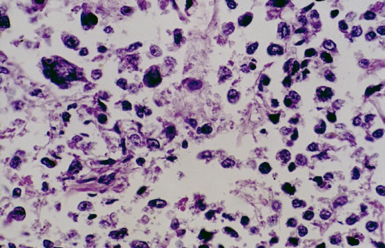 High power shows the tumor cells with scant acidophilic cytoplasm and enlarged hyperchromatic, varying-sized, round to oval nuclei.
