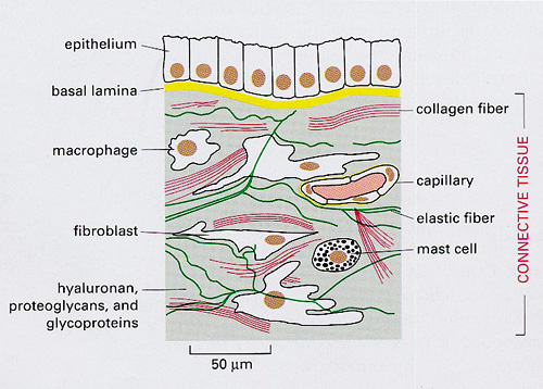 ภาพวาดแสดงลักษณะและองค์ประกอบ ของเนื้อเยื่อเกี่ยวพันที่อยู่ใต้ต่อแผ่นเนื้อผิว โดยมีองค์ประกอบของพวกเซลล์ต่างชนิด และ extracellular matrix components เซลล์เนื้อเยื่อเกี่ยวพันชนิดที่พบเด่นชัด คือ fibroblast มีหน้าที่สร้างและหลั่ง extra-cellular matrix เป็นจำนวนมาก