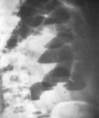 ลักษณะทางภาพรังสีคือจะมีการโป่งขยายตัวของลำไส้เล็กส่วนที่อยู่ก่อนจุดอุดตัน
