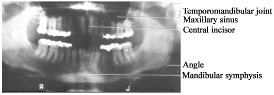 ให้ขนานกับฟิล์ม จัดกึ่งกลางของลำรังสีอยู่ที่ mandible และเอียงหลอด 25o