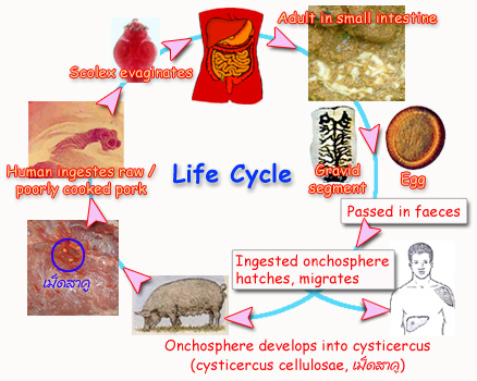 เมื่อคนรับประทานเนื้อหมูที่มีระยะนี้เข้าไป ตัวอ่อนจะเจริญเป็นตัวแก่ในลำไส้ต่อไป