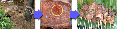 เมื่อไข่หรือปล้องเหล่านี้ ปนเปื้อนในอาหารที่เลี้ยงหมู ทำให้ embryo