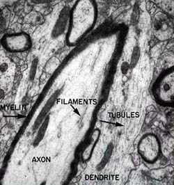 เป็นส่วนที่ต่อจาก initial segment ประกอบด้วย organelles เป็นจำนวนมาก เช่น mitochondria, microtubules neurofilaments (รูปที่ 31) และ smooth endoplasmic reticulum ไม่พบ free ribosom และ rough endoplasmic reticulum ดังนั้น axon จึงไม่มีหน้าที่ในการสังเคราะห์โปรตีน axon ส่วนใหญ่จะถูกหุ้มด้วย myelin ซึ่งเป็นโครงสร้างที่ประกอบด้วย cell membrane เป็นชั้นๆ ซ้อนๆ กัน (รูปที่ 32) ใน CNS myelin สร้างโดย oligodendroglia ส่วนใน PNS จะสร้างโดย Schwann cells