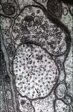 ในระบบประสาทของสัตว์มีกระดูกสันหลัง เมื่อศึกษาโครงสร้างของ synapse ด้วยกล้องจุลทรรศน์-อิเลคตรอน พบว่า synapse ประกอบด้วย