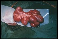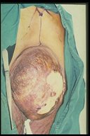 The overlying skin looks normal in the case with skin closure but adheres to the organs underneath
