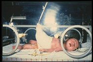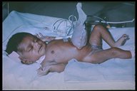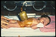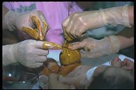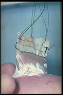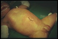 Various artificial material is used for temporary covering of the herniated organs, silastic sheet is demonstrated