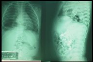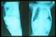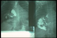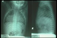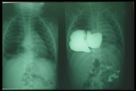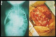 Plain X-ray (right ) and contrast study (left) in a child with right-sided diaphragmatic hernia with sac, the contrast outlined the bowel in the right thoracic cavity