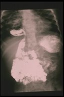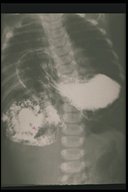 Contrast study outlined the stomach which is herniated into the chest cavity (soft tissue mass shadow ) in a child with hiatal hernia