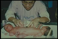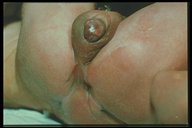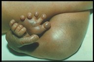 Deformed lower extremity ( the third leg) is demonstrated. Separation of the toe and some part of sole are noted